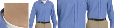 3.4 oz., 100% cotton yarn-dyed poplin; semi-fitted styling; contrast checked pattern; narrow-soft collar; roll sleeve option with button and tab fastening on upper arm; single button cuff and sleeve guard for long-sleeve styling; curved hemline; Oeko-Tex® Standard 100 certified; WRAP certified;